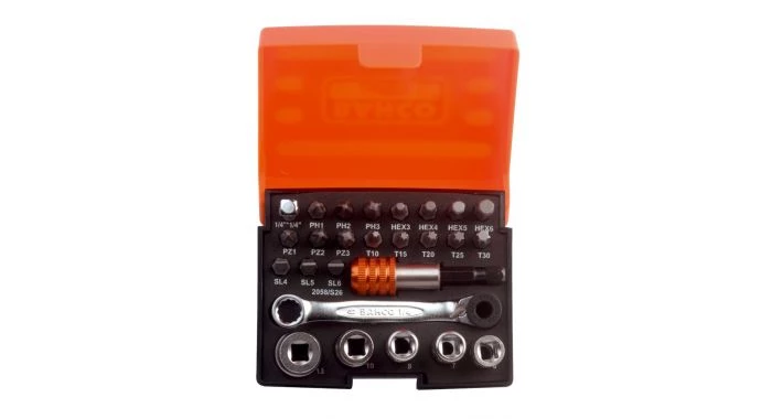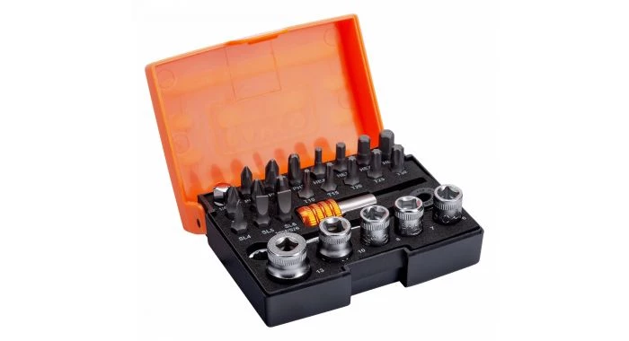 Contient 26 pièces : 18 embouts + 5 douilles + 1 cliquet à embout + 1 adaptateur + 1 porte-embout